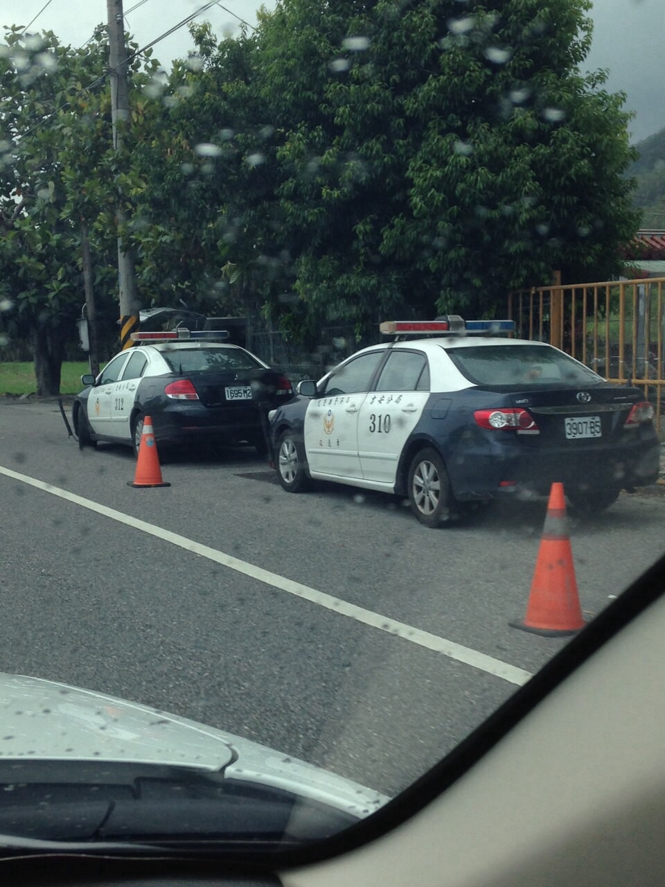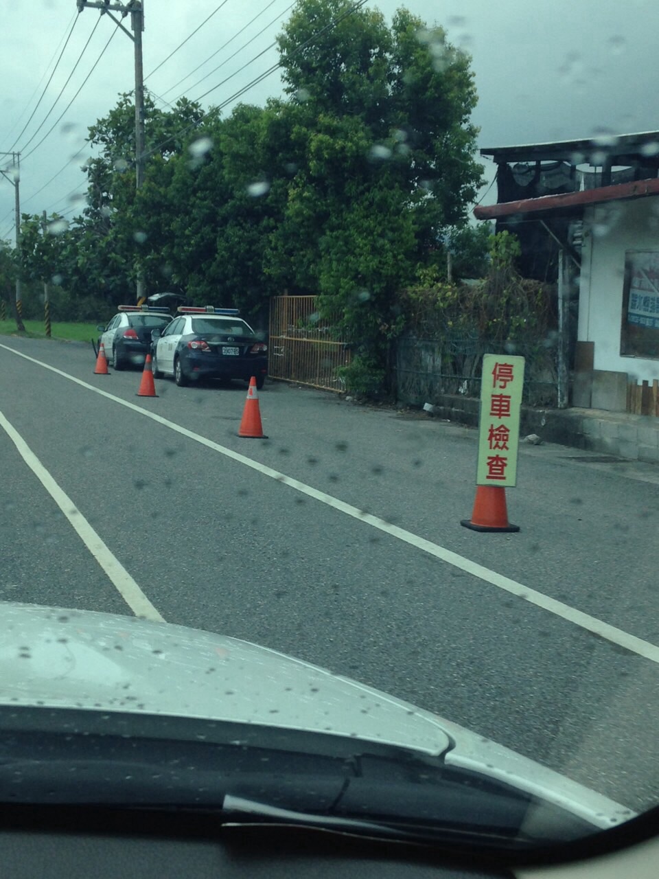 經過時剛好下雨了,條杯杯收槍躲到車內避雨。