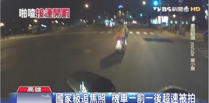 機車騎士按照路面標示的限速50,乖乖的行駛在機車道上,這個時候前方的機車,突然連續兩個閃光,拍下了接連兩部超速的機車,第2部機車被拍照時,煞車燈亮起機車還往右偏移似乎被嚇了一跳,後方車主把行車紀錄器PO上網,快速又神準的測速器,讓網友笑說這真是國家級追焦照,還有人說這是漂亮的double play「政府感謝你的罰金」。