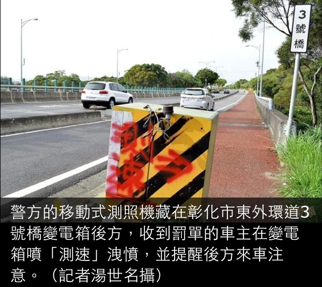〔記者湯世名/彰化報導〕變電箱有「鬼」?彰化市東外環道往台中方向的3號橋一座變電箱後方,藏了一支移動式測速照相機,許多超速車輛紛紛「中彈」,有人氣得用紅漆在變電箱上噴「測速」兩字並PO網,引發網友砲轟警方「搶錢!」交通隊表示,已依法在測速照相機前方200公尺設置告示牌,不過,為免爭議,已決定「化暗為明」,另覓適當地點放置測照機,但也呼籲用路人不要超速。