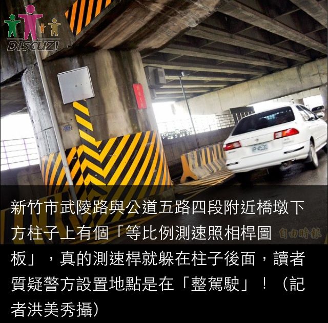 新竹市讀者投訴說,武陵路與公道五路四段方向東西向快速公路下方道路有處測速照相桿,先是在橋墩柱子前方「畫」 ...