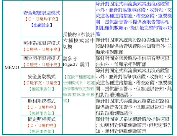 語音:告知目前警示模式設定值與雷達感度設定值