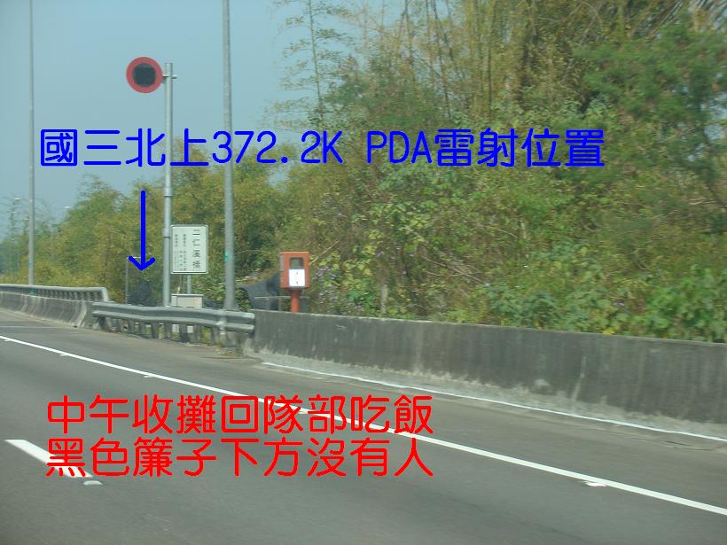2/19 14:45 國三北上372.2K,一出田寮收費站一公里處,PDA雷射打靶,固定角度連續自動射擊,人員躲在下方邊坡臨時搭建的黑色網廉下納涼. (這個地點好像沒有營業告示牌)