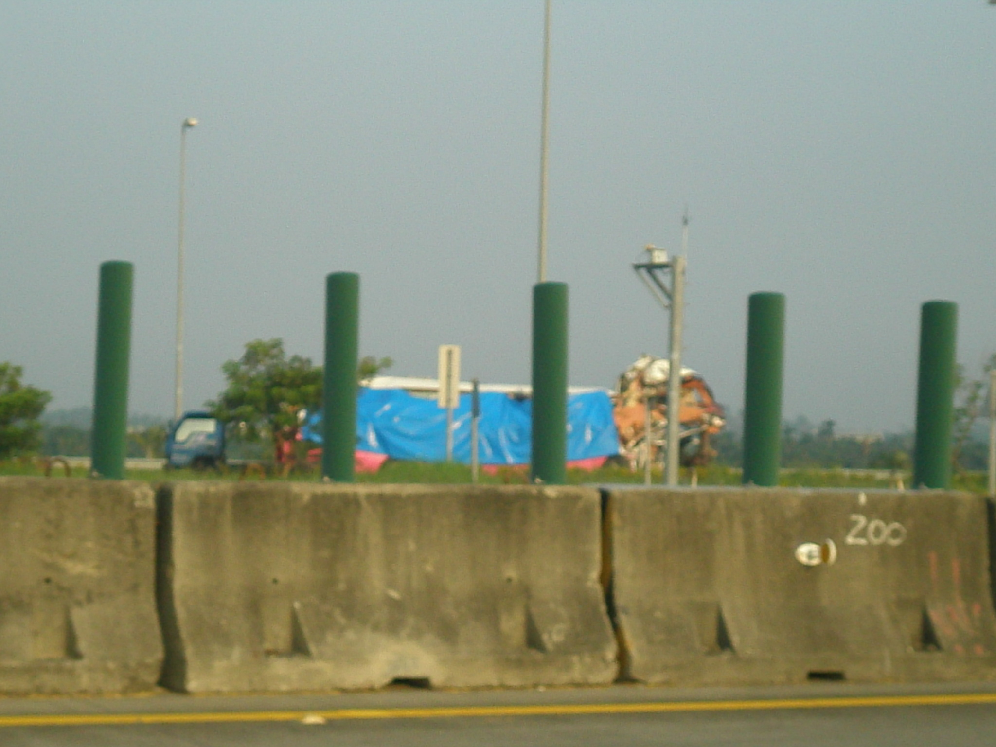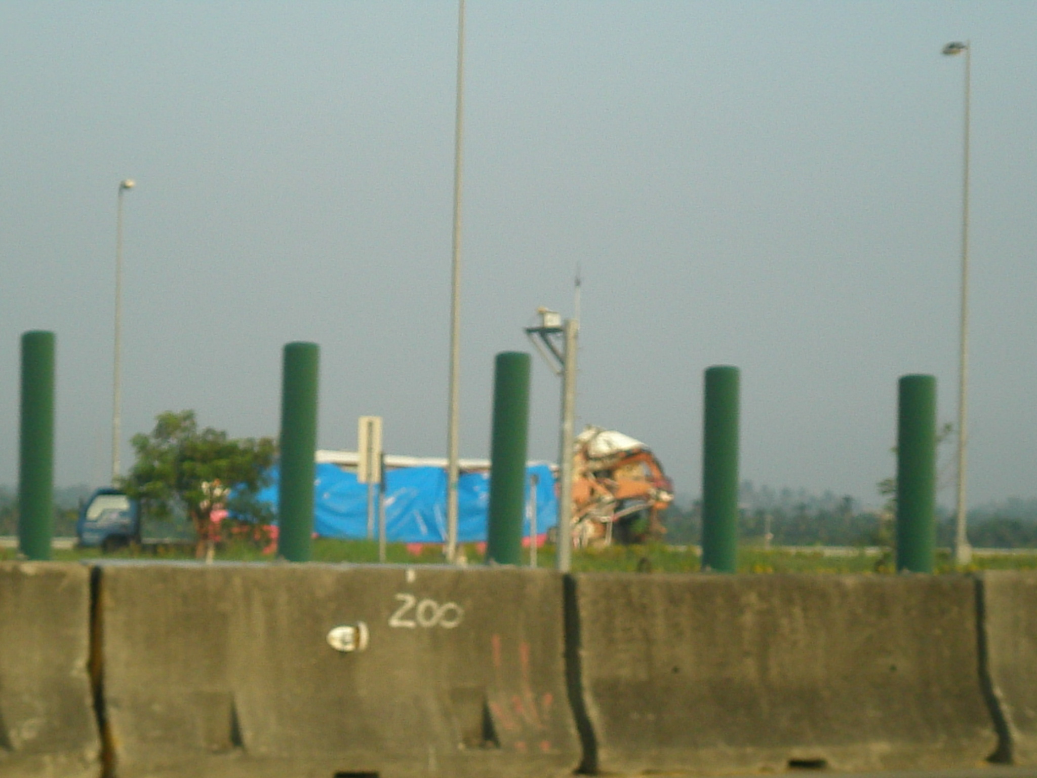 10/12由二高竹田交流道北上時經過收費站看到先前二高南下協張橋前的遊覽車追撞事件,兩台車都被拖到竹田收費站旁,遊覽車看來真的損傷慘重