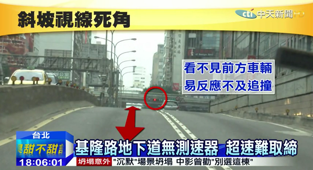 發生追撞車禍的基隆路地下道,其實意外頻傳,因為這段地下道又長又直,駕駛一開進地下道,就會不自覺得加速,加上密閉空間又有粉塵等因素,無法