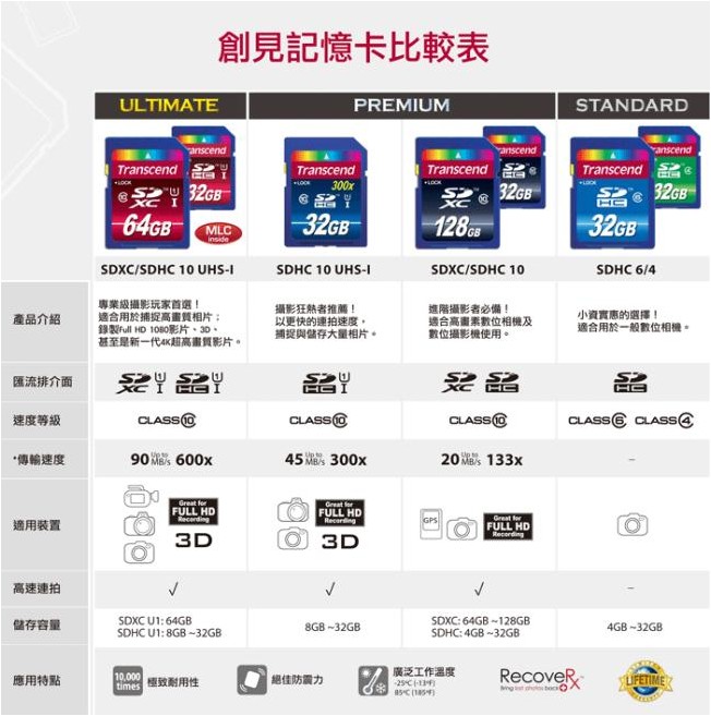創見記億卡讀寫規格表給您參考如下